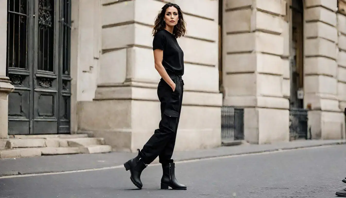 - Вечером в городе: черные карго + топ на бретелях + жакет + ботильоны или лоферы — и образ готов.